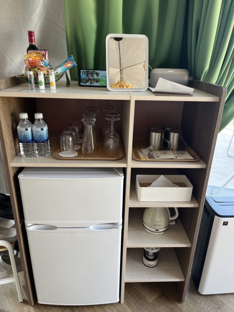 冷蔵庫の中にはビールやソフトドリンクが入ってますが、こちらは有料(チェックアウト時精算)なので気をつけてください。