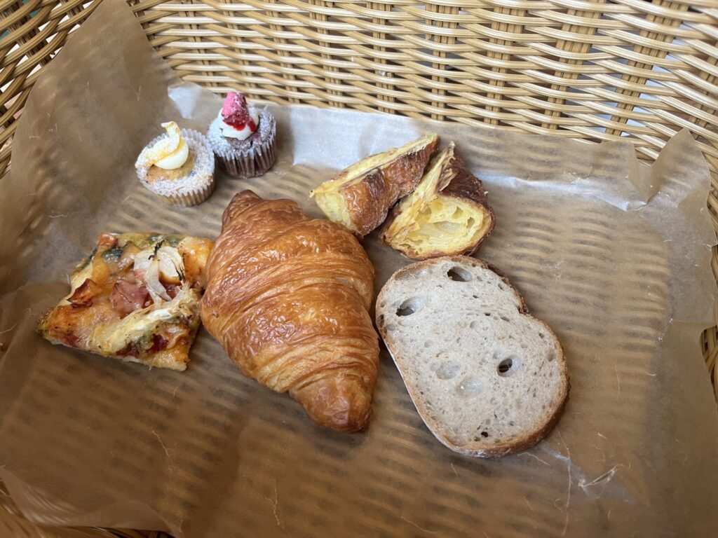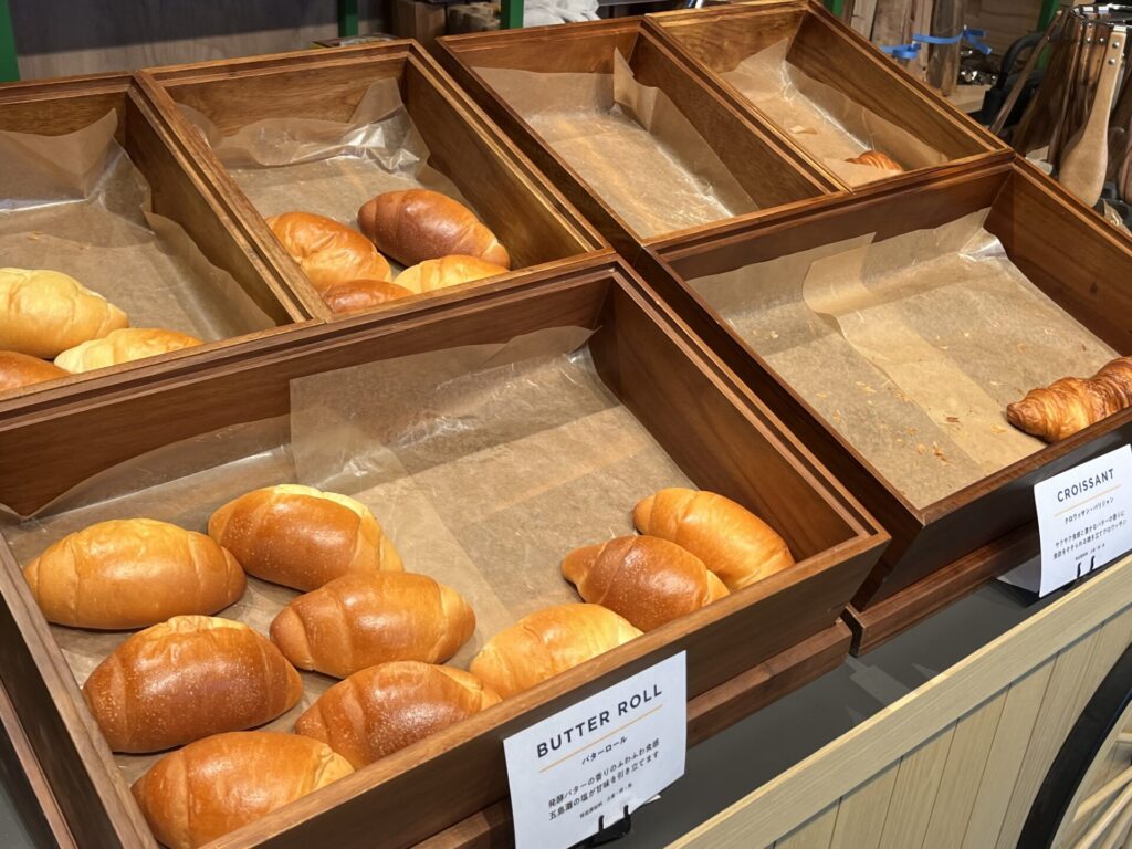 パンは約10種類から好きなだけ取ることができます。外には、焼き立てのホットドッグもあります。