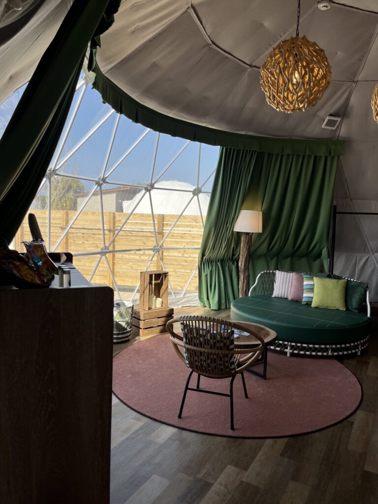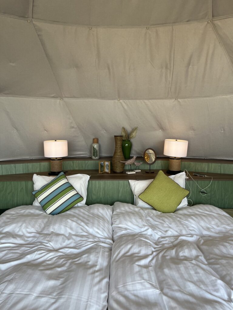 38㎡の空調完備のドームテントにはふかふかのベッドにリビングスペース。