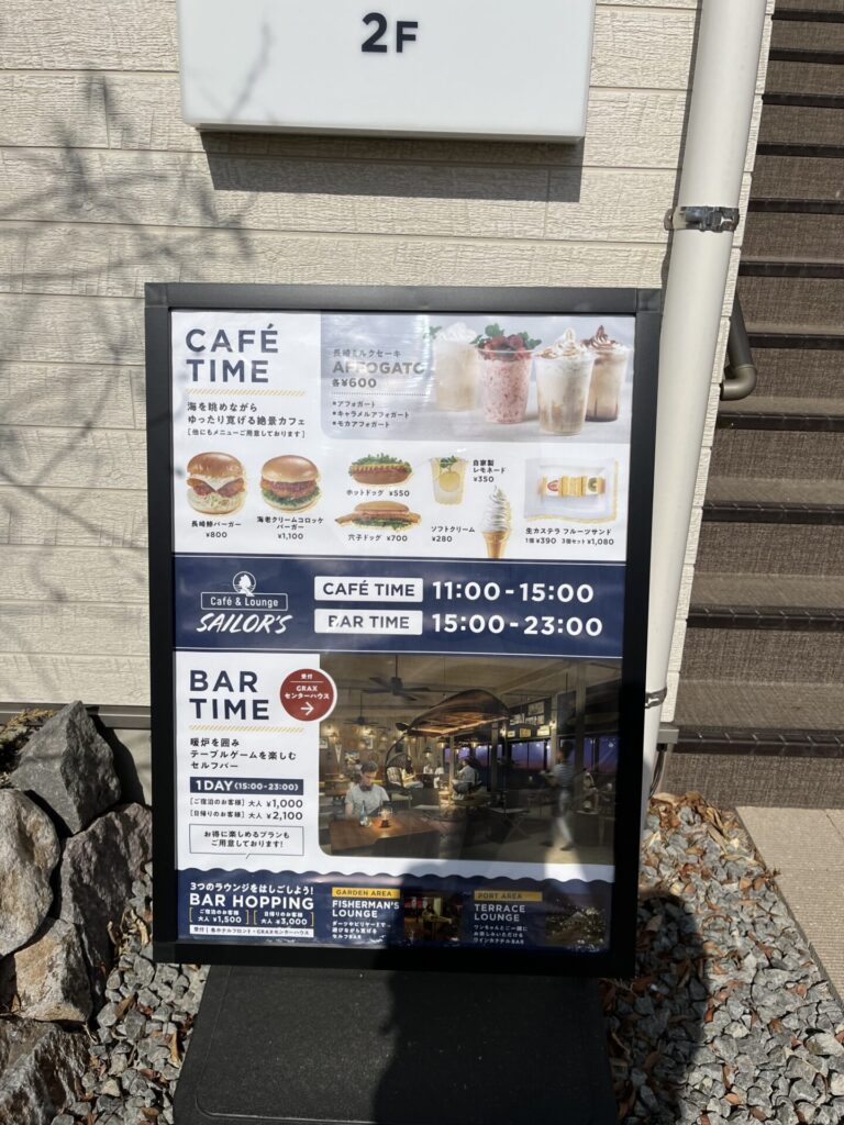 海沿いの中央にあるこの建物は、一階が売店、二階がカフェ&バーです。