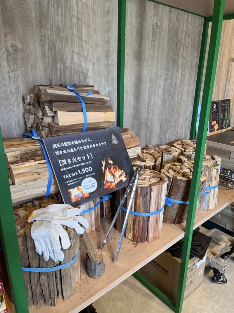 テントサイトで楽しめる、焚火の薪や飲み物、お菓子、カップ麵などが売っています。