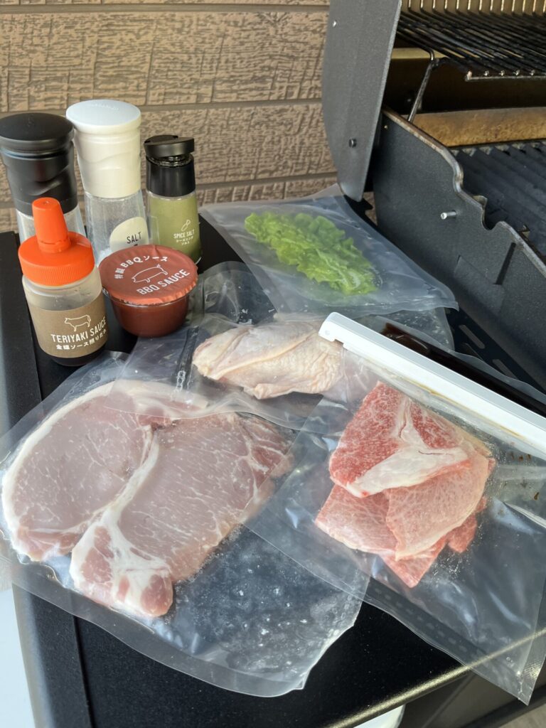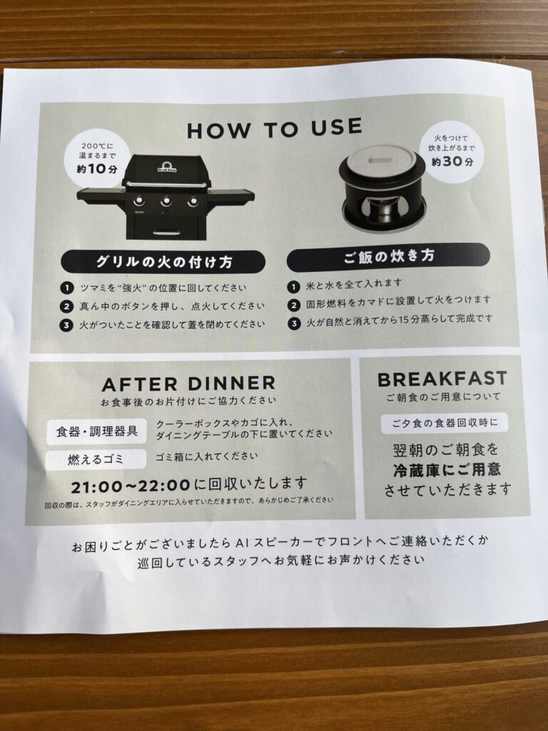 食材はBBQ棟に準備されています。BBQグリルを使ったことない人でも簡単に出来るように説明書も入ってますのでご安心ください。